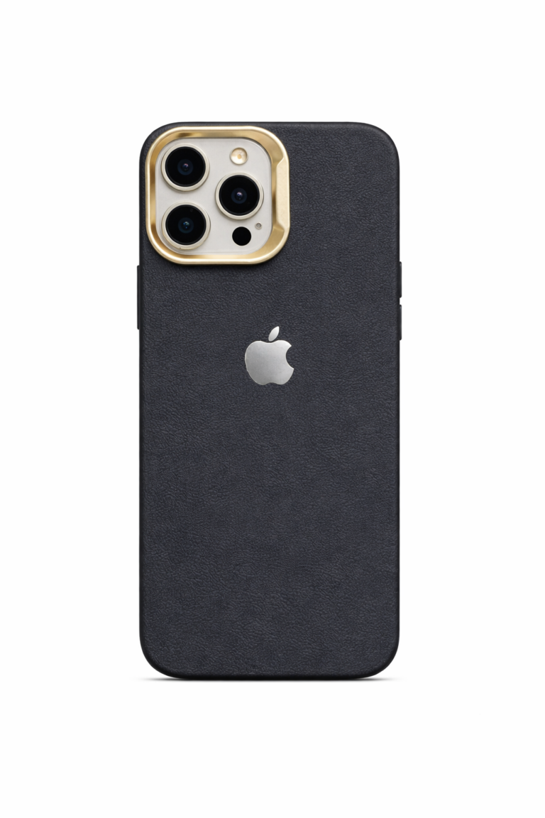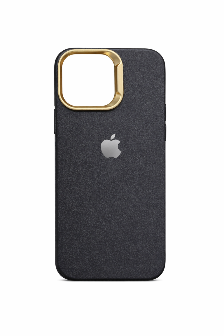 Premium Black PU Leather iPhone Case with Metal Camera Ring.